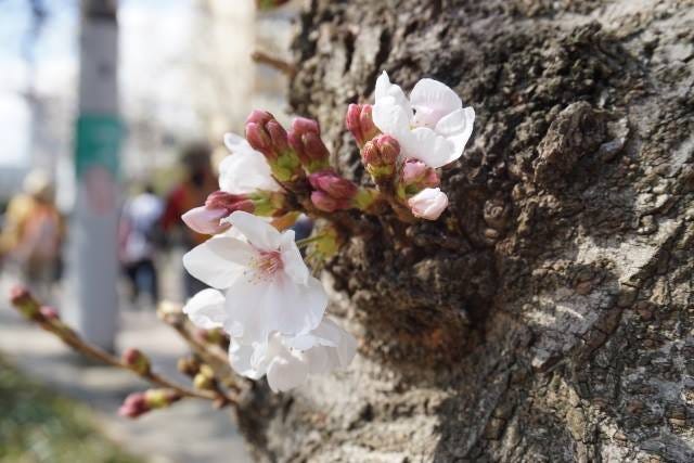 是說日本人真的很瘋賞花,為了賞花可以派代表徹夜鋪野餐墊佔場,除了小家庭、朋友或同事間的野餐,這幾年在櫻花樹下的「戀活」(聯誼)也很流行。比起在櫻花樹下野餐,我反而比較喜歡不期而遇:「原來這裡也有櫻花啊!」的感覺。事實上我看到的第一個櫻花花苞和第一朵盛開的櫻花,都是長假期間去學校圖書館時意外在工學院看到的,每次上下學都會經過的路旁,卻從來沒注意過原來這就是櫻花樹。(老實說櫻花的品種很多,我現在只能認得一種樹型而已)