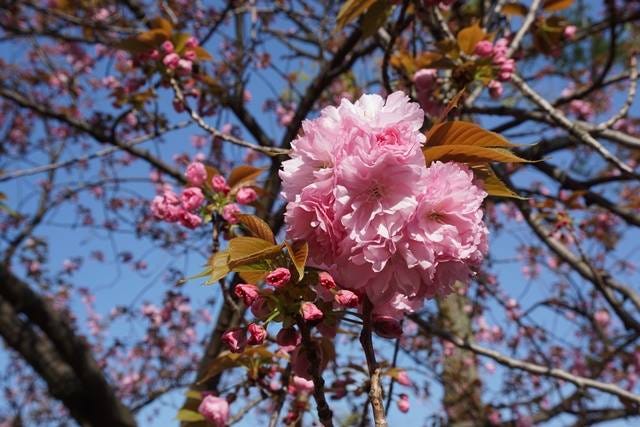 大阪造幣局櫻花通道之所以特別,是因為整條路收藏了來自日本各地的著名品種,一年當中就只開放一個星期可以入內參觀。因為本來就是設計來讓大家盡情欣賞賞櫻樂趣,幾乎每一株的高度,妳不需要特地使用那空出來的一雙手「調整」一下櫻花的角度,它們就真的在臉旁邊了。櫻花的品種很多(小常識,「里櫻」指的是園藝家自己配出來的品種,反義詞大自然原生種叫做「山櫻花」),花期也都有所不同,基本上大阪造幣局的櫻花花期都比較晚,所以即使「櫻前線」(天氣預報報導的各地櫻花開花情況,每一個地區會有一棵標準木當作指標,大阪的櫻花標準木在京橋)的公告已經說大阪「櫻滿開」了,可能大阪造幣局的櫻花通道都還沒開放時間呢!