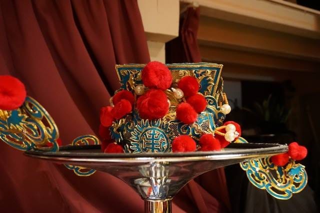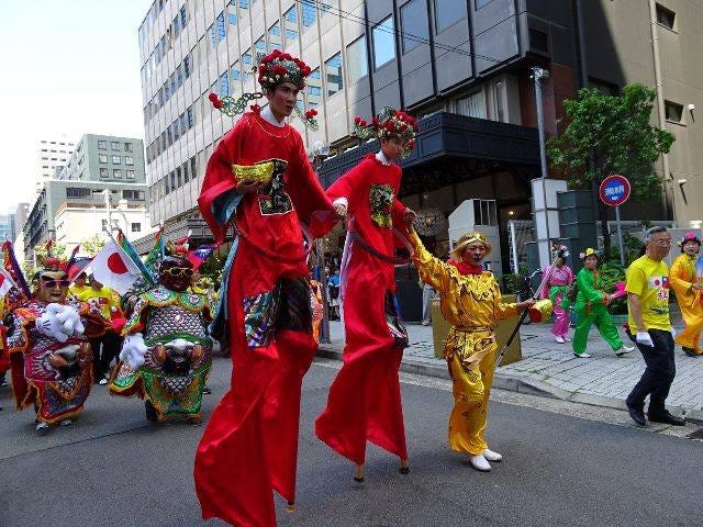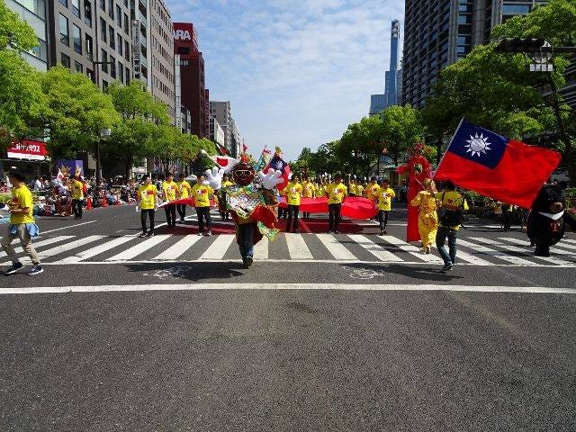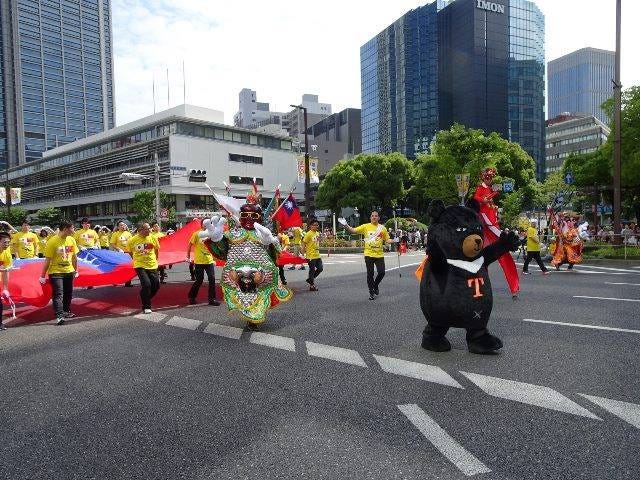 神戶的華僑總會今年是第三年組隊報名參加神戶祭,我也應邀共襄盛舉這場在海外大舉中華民國國旗的盛會。我們的隊伍從前到後有:從台灣請來的孫悟空、採高蹺財神爺劇團、台灣嘿熊、身後插著台日國旗的電音三太子、超大面國旗、健康操舞蹈隊和十二金釵旗袍隊。(附圖是財神爺的帽子)