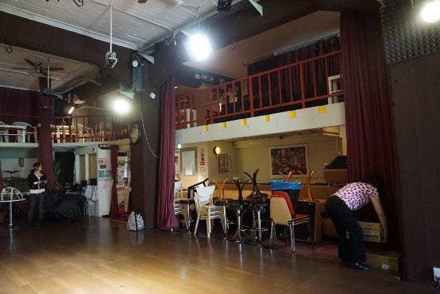 再讓我murmur一句,華人真的是會投資。我們的練習地都在自己人的「古蹟」裡面,1946年見的私人小型公會堂(表演廳、練團室)長這樣,真的很驚人(這棟大樓是「舊居留地100號」,又稱「高砂」大樓,很想問卻又不知道該如何開口這高砂和「那個高砂」有沒有關……)